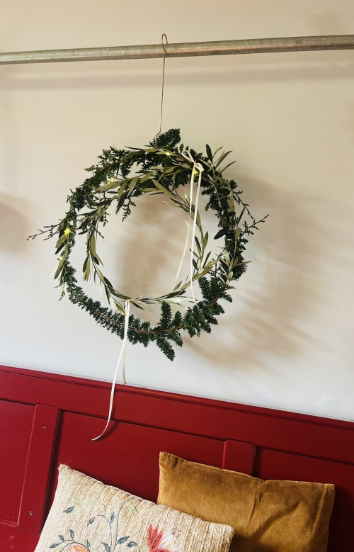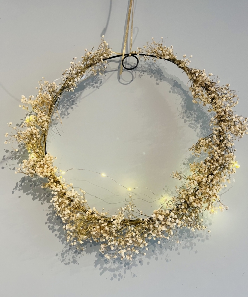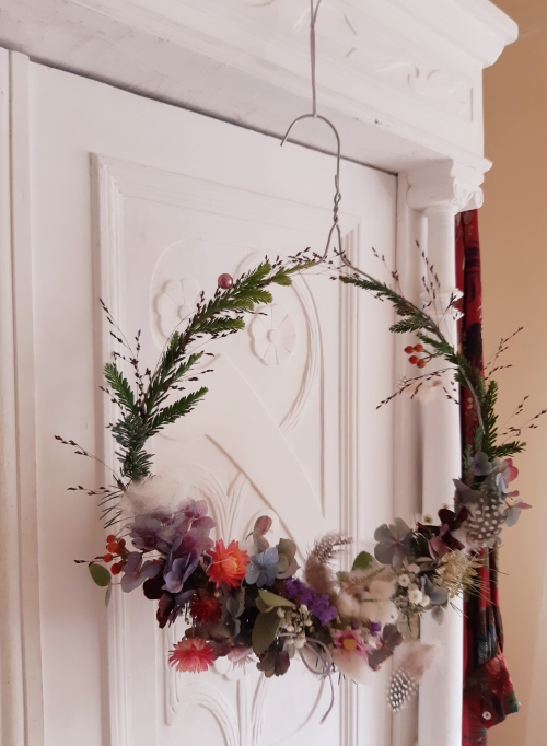 Als de vorm klaar is ga je deze verfraaien met (droog)materiaaltjes zoals hortensia, bessen, trilgras, zijden bloemen, wol en bv.eucalyptus of lavendel. Alle soorten droogbloemen zijn hierbij superleuk om mee te werken en lang houdbaar! Glitterblaadjes, asparagus, parels, veertjes zorgen voor een feeërieke sfeer. Deze mooie hanger kan aangepast worden aan de sfeer van ieder seizoen. Met kerst gebruiken we ook heerlijk geurdend dennengroen, lichtjes, kerstballen, appeltjes, lint, extra glitter en sneeuw.